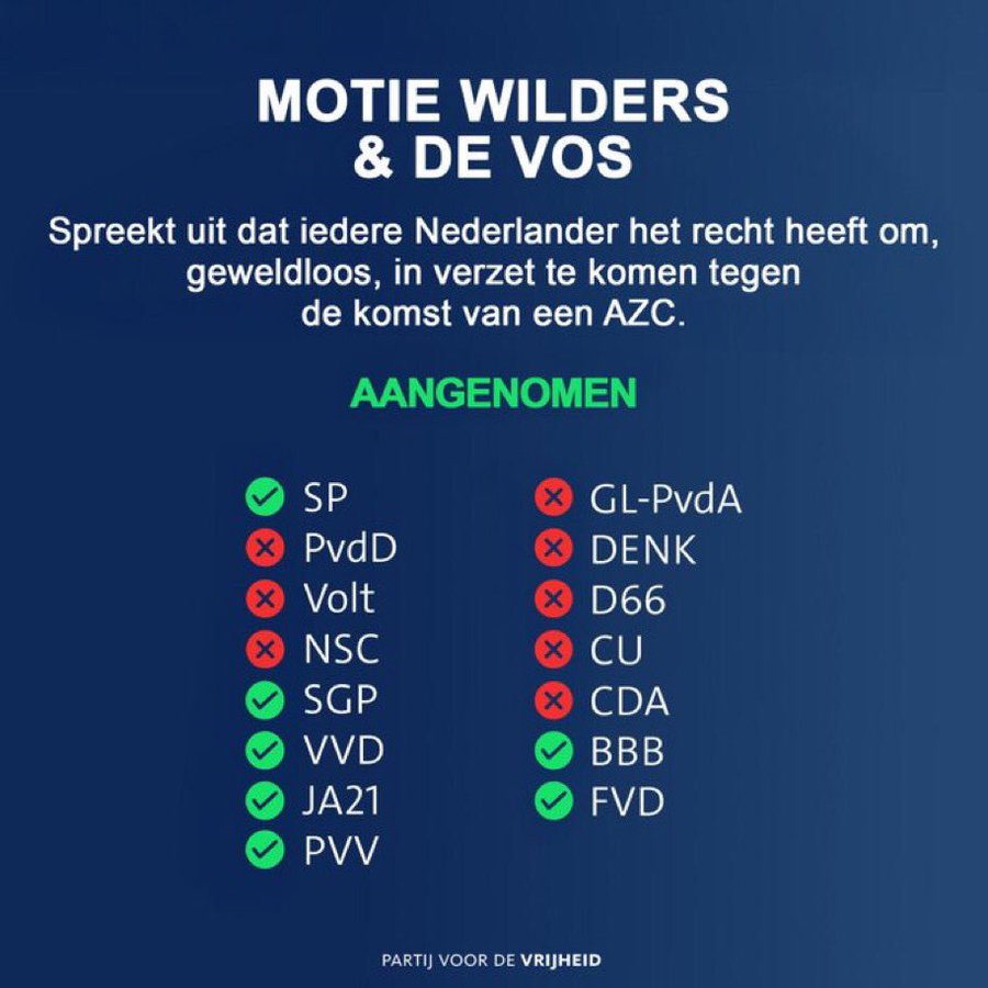 Den Haag – De Tweede Kamer heeft een motie van de PVV en Forum voor Democratie aangenomen die burgers expliciet het recht geeft om te demonstreren tegen de komst van een asielzoekerscentrum (AZC). De motie werd door beide partijen gepresenteerd als een overwinning voor de vrijheid van meningsuiting.