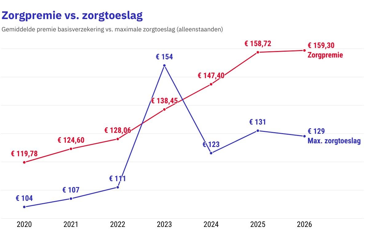 Zelfs de allergoedkoopste basisverzekering biedt nauwelijks verlichting. In 2020 hield een alleenstaande met maximale zorgtoeslag nog zo’n € 2 per maand over. In 2026 verandert dat voordeel in een nadeel: men betaalt dan ruim € 13 per maand bij. Het verschil bedraagt ruim € 15 in zes jaar tijd.